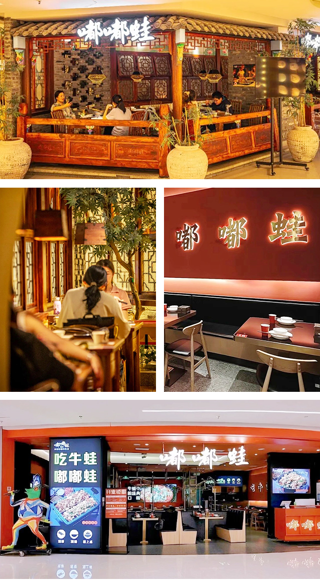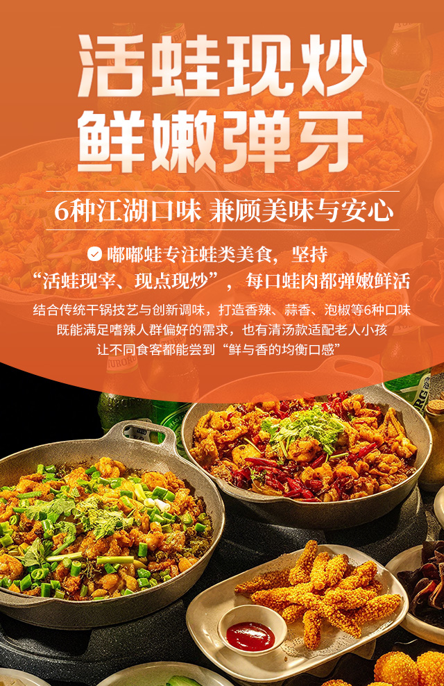 嘟嘟蛙不跟风做火锅、烧烤,专注蛙类核心食材,不添加其他辅助荤菜。所有研发精力集中在蛙类——从牛蛙腌制时间到调料配比,经过上百次调试,之后打造6种特色口味,覆盖不同食客偏好,让“蛙味”成为核心记忆点。
