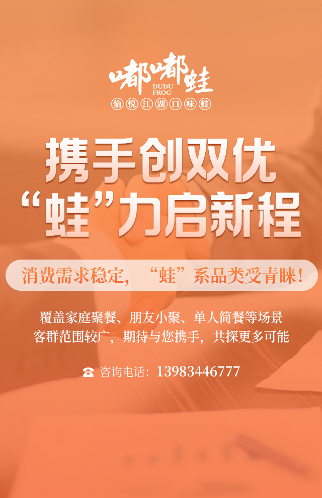嘟嘟蛙是一家聚焦蛙类美食的餐饮品牌,发展至今已有数年,2017 年正式注册品牌,目前在重庆市几大核心区均开设了同品牌餐饮店。品牌主打江湖口味干锅蛙,始终专注提升蛙类本身的风味,力求让顾客的味觉集中在美蛙上。